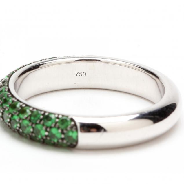 Centered with one round brilliant cut diamond (3.00mm) weighing approximately .10 carat (F color, VS clarity) and with (48) pavé set round cut tsavorite gemstones (1.50mm) and (2) at (1.00mm) in a white gold mount stamped 18KT and signed "Danhier" for Christophe Danhier.