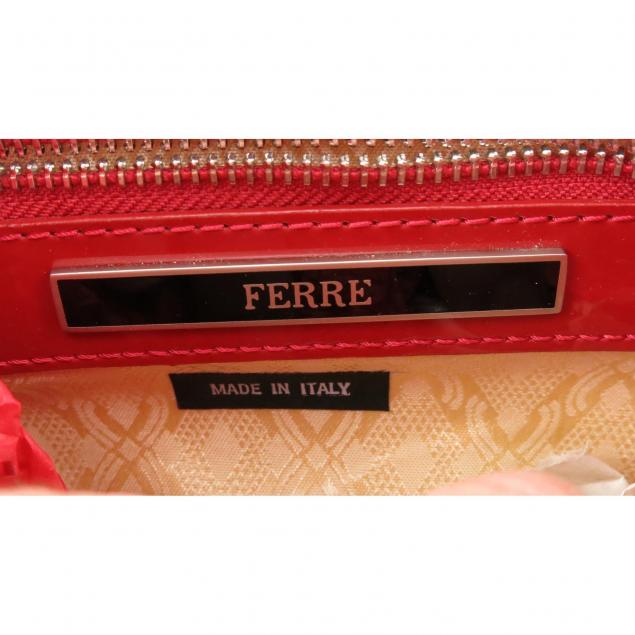 The first is of neutral tone canvas with leather trim, Rene, made in Italy (9 x 12 x 2.5 in.); the second a red nylon "camera" shoulder bag with leather trim, Prada, made in Italy, with dust bag; the third, a woven red nylon with red patent leather and pewter trim, Ferre' made in Italy (7.5 x 11x 3 in.) (one patent leather corner stained).