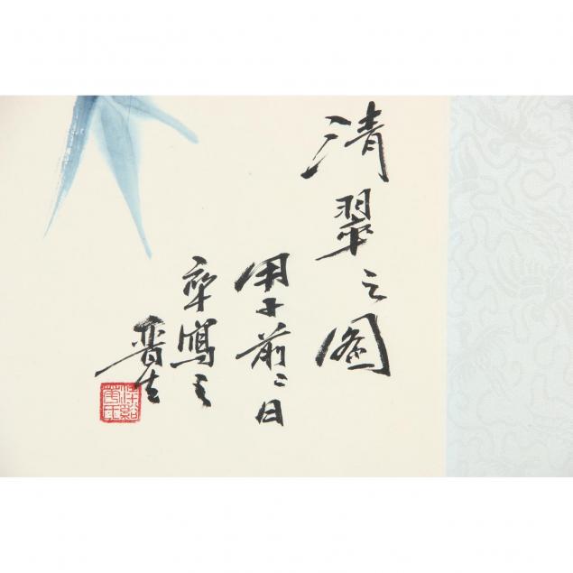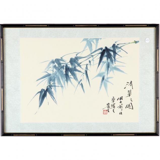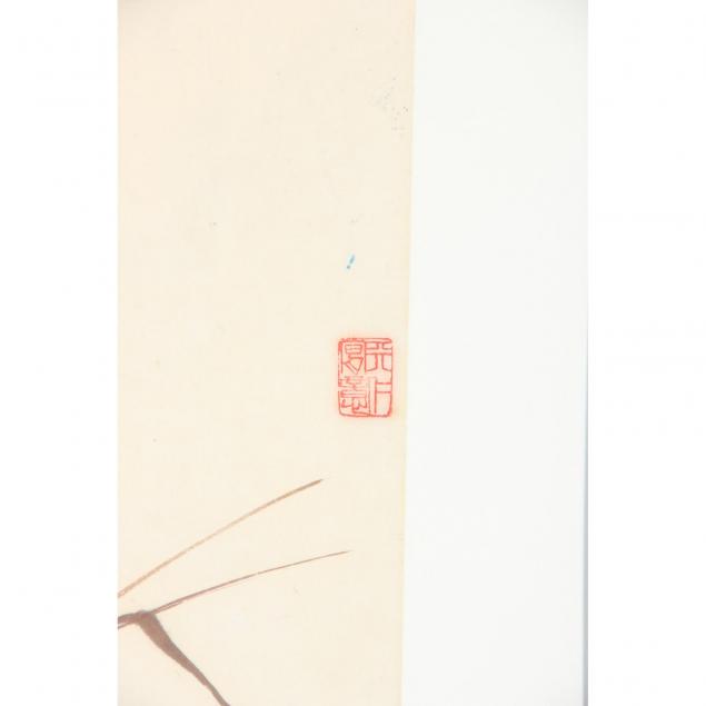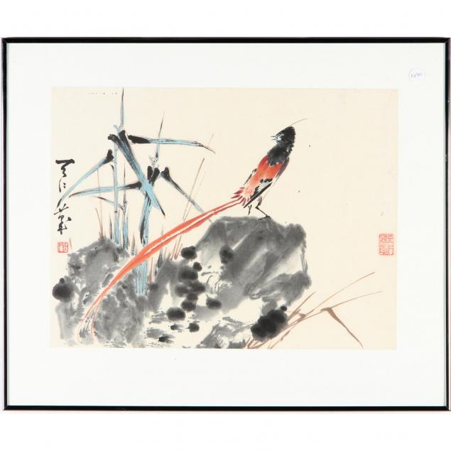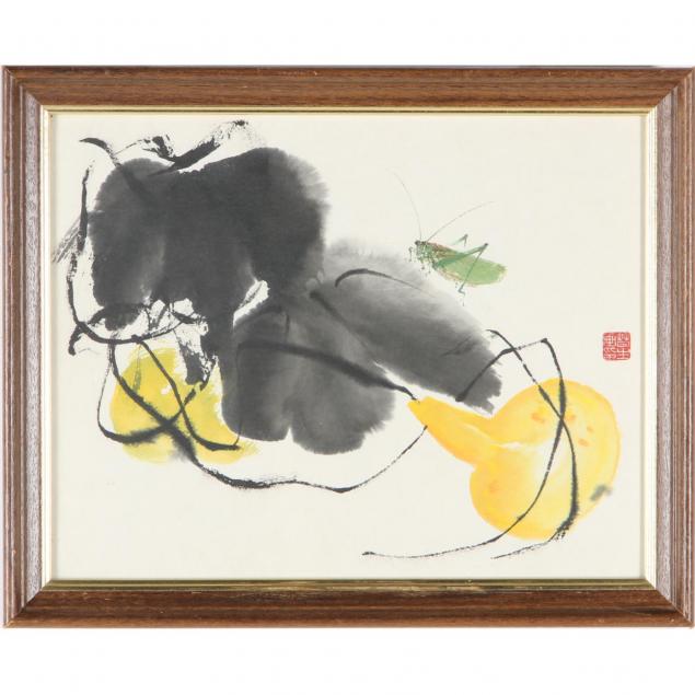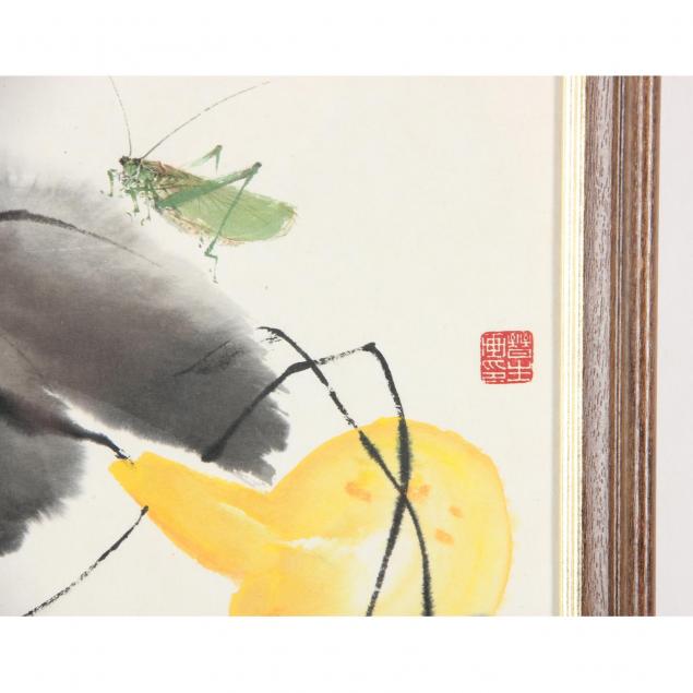 The first a fruit and leaves with grasshopper, red seal (DOA 12.75 x 15.75 in.); the second a bird on rocks with bamboo, signed and with two seals (DOA 19 x 23 in.); the third of bamboo, with calligraphy and stamp (DOA 18 x 26 in.
