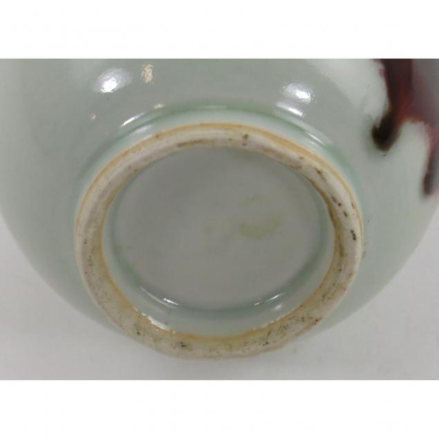 20th century, unmarked, celadon glaze with peach bloom to both sides.