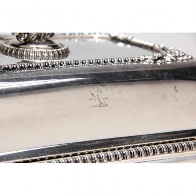 Rectangular form in three parts (excluding removable loop handle), unmarked, circa 1830-1840, the warming base with branch form handles and foliate scroll bracket feet, the cover with rampant lion engraved crest.