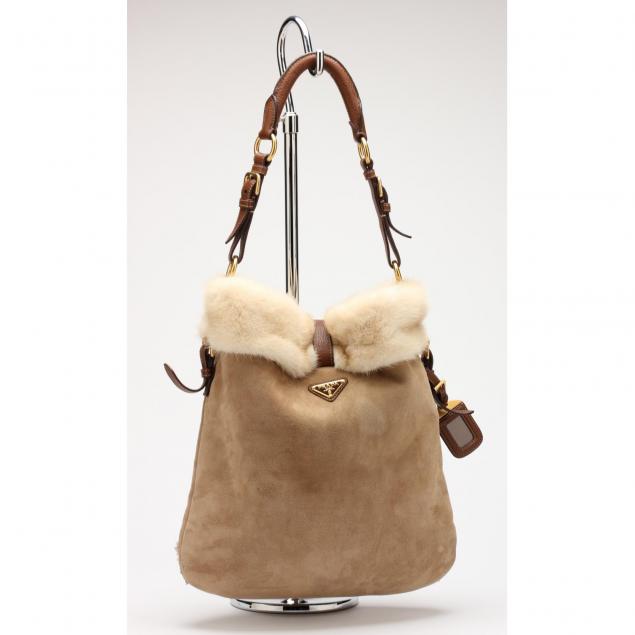 Made in Italy, taupe suede with appliques to one side, top with wide band of white mink trim, adjustable leather shoulder strap, strap and buckle closure to open interior.