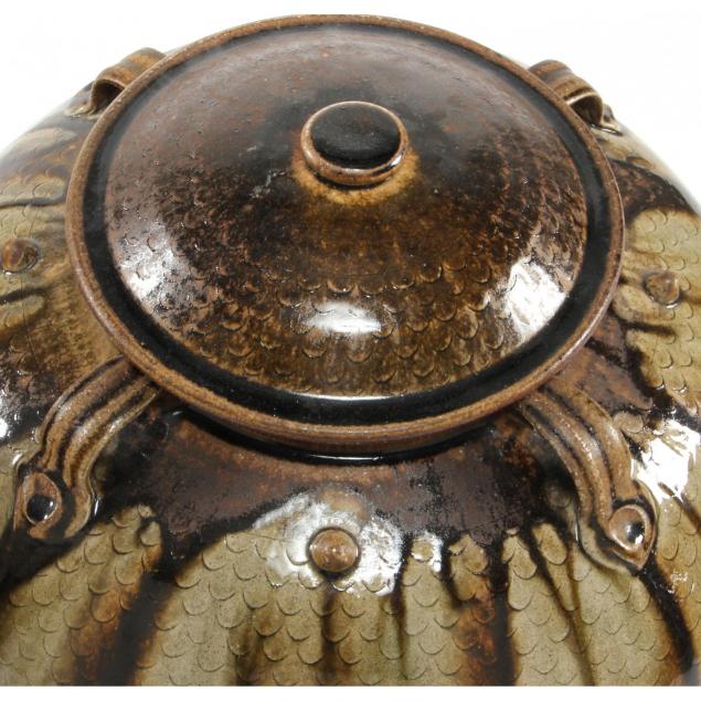 Each of strongly tapered ovoid form with four applied strap handles, alternating with applied knobs, domed covers, precisely incised scale decoration to covers and shoulders, full length glaze drips, both signed "D. Craven 2005."