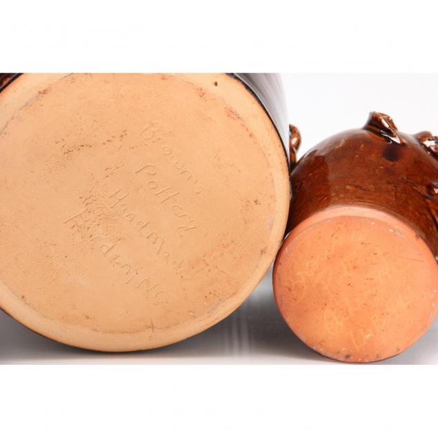 A small face jug with china plate teeth, signed "LDB 94" (Louis Brown) (7.25 in.) and a large fearsome devil jug embellished with curving horns, sharp fangs, and a snake, signed on the bottom "Browns Pottery" (11.25 in.)