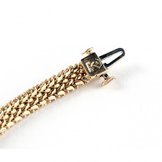 The yellow gold mesh necklace set to the front with a diamond station comprised of (7) bezel set round brilliant cut diamonds weighing approximately 1.47 total carat (K color, SI1 clarity) terminating in an integrated box clasp.
