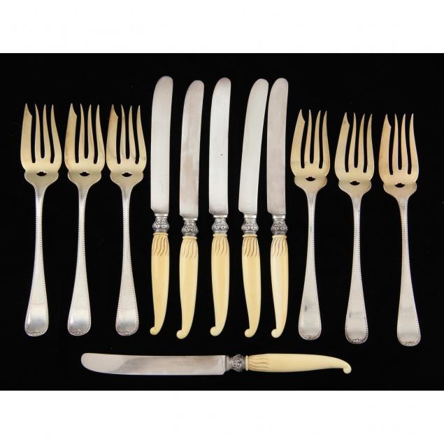 Including a set of (6) forks by Gorham with gold wash to tines (5.7 troy oz.) and a set of (6) faux ivory handled fruit knives in the style of Whiting (7 in.).