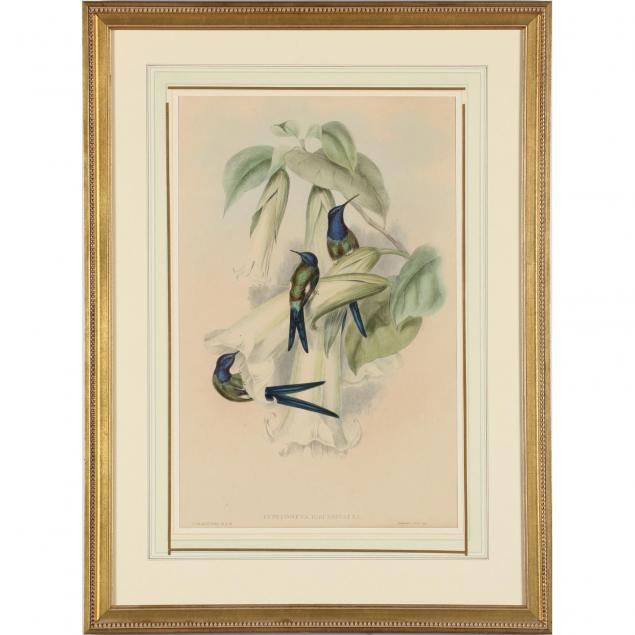 19th century with hand-coloring, published by Hullmandel & Walton, birds illustrated ar "Patagona gigas" and "Eupetomena hirundinacea." Matted behind glass in frames.