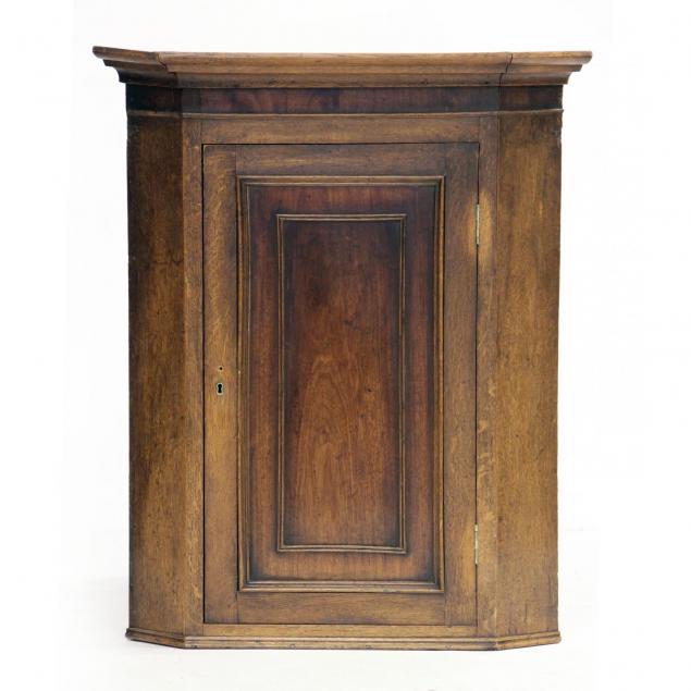 Late 19th century, oak with pine secondary, applied cove molded cornice, mahogany veneer frieze, paneled hinged door, with butterfly hinged interior.