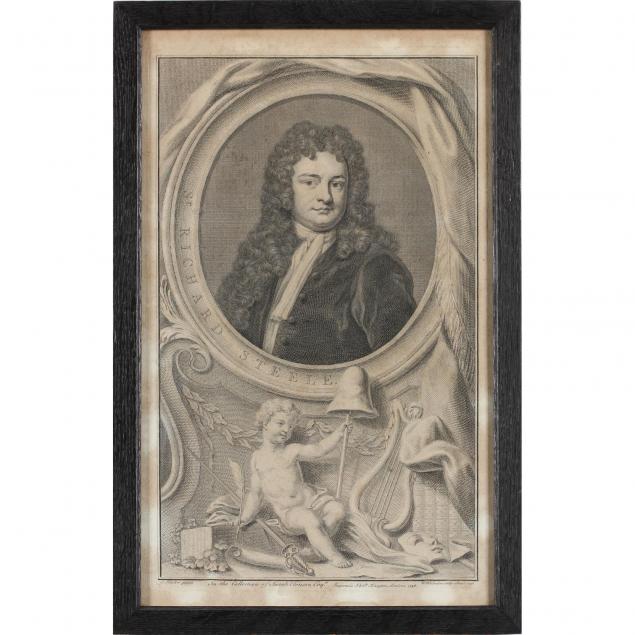 Subjects depicted are Mary Queen of Scots, King Charles the First, Sir Richard Steele and John Dryden. Each presented under glass in ebonized frames.