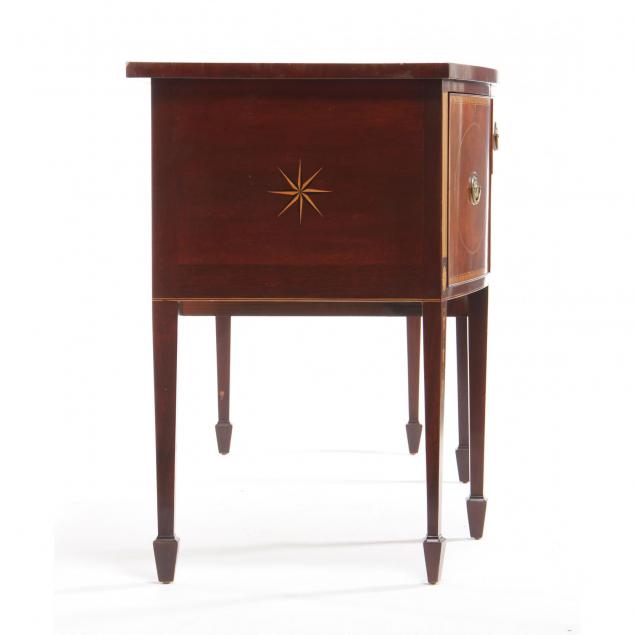 Interior burn label and metal labels, pattern no. CW300-WF, mahogany, mahogany veneer, light and dark wood inlays, bow front, central drawer above two hinged doors, flanked on the left by one deep drawer and on the right a single large hinged door, the case raised on six square tapered legs with spade foot.