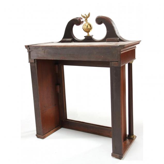 The Personal Collection of Mr. Philip H. Huggins, Fayetteville, North Carolina Later feet; replaced rosette terminals at bonnet and finial; replaced glass; warp to waist door; horizontal shrinkage crack to veneer at base.
