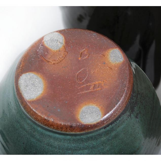 With lids, the first appears to be an ash glaze with slip, signed and dated 2009 (12 5/8 in.) and the second has a frogskin glaze, dated 1999 (12 in.); the third has a celadon glaze dated 2000 (11.25 in.)