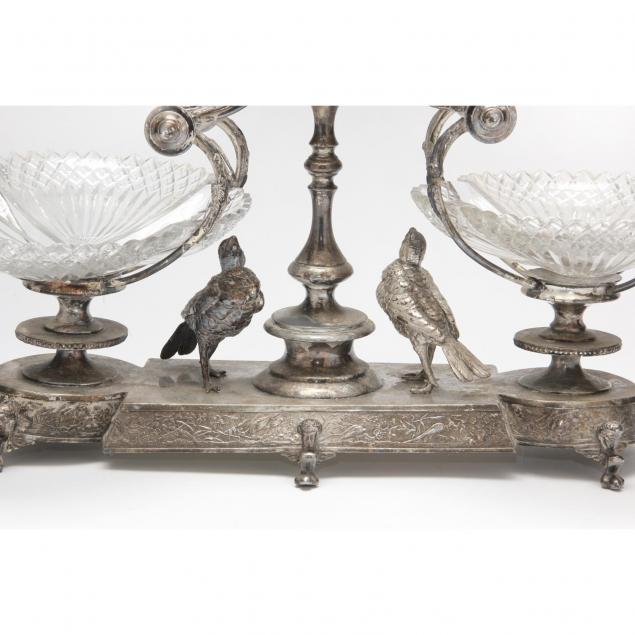 Unmarked, circa 1870s, the shaped base with two fully modeled songbirds to center and raised on six female mask and paw feet, the frame supports two cut glass lobed dishes and two bud vases.