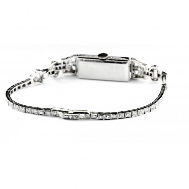 The diamond accented rectangular case with ivory dial and applied black enamel Arabic numeral indicators completed with a diamond accented bracelet band with fold over clasp, diamonds are bead and pavé set and weigh approximately 2.36 carats (G-H color, VS - SI1 clarity) and include (4) Marguise, (2) straight cut baguette, and (120) single cut round.