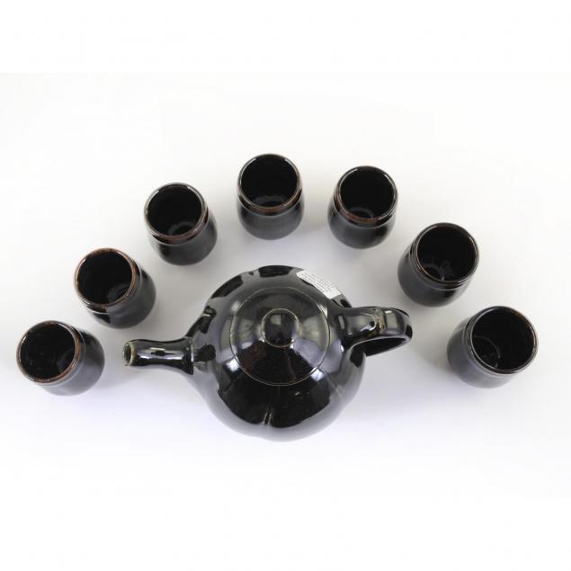 Variant of Mirror black glaze, the rims with brown tones, the group is composed of a lidded teapot (6.5 in.) 2011 and (7) cups 2008, all signed.