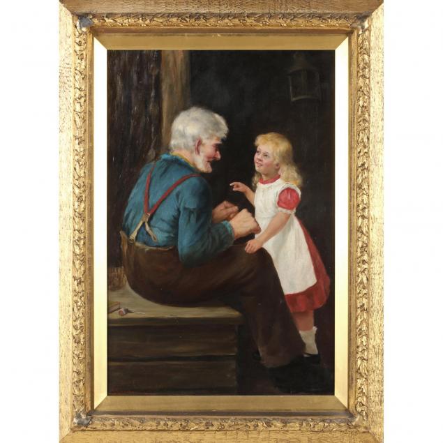 Oil on canvas, pleasing genre scene where a small child is playing with her grandfather, guessing which hand holds a treat, signed lower left "D.W. Haddon," housed in an appropriate gilt wood frame.