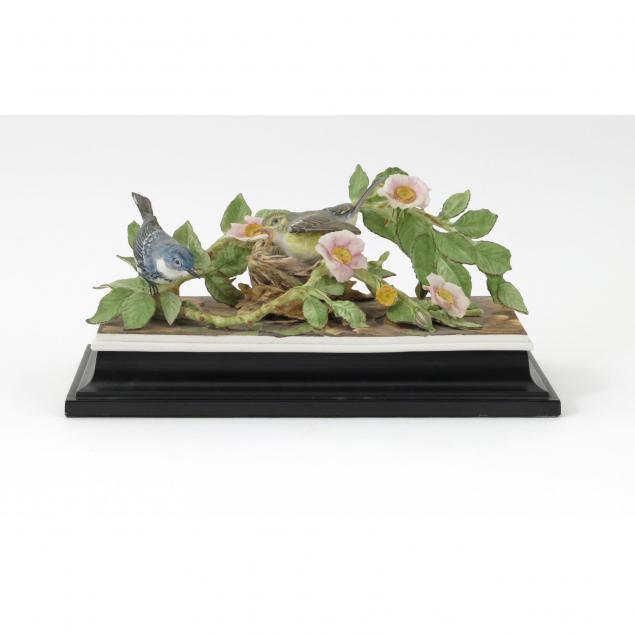 Bottom not stamped, nesting pair amidst wild rose vines, with rectangular ebonized wooden plinth base, signed "Boehm" on porcelain.