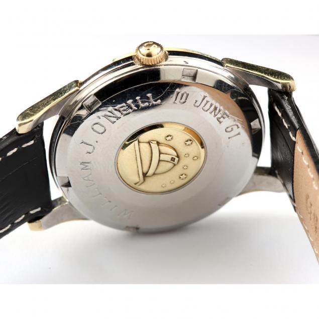 Circa 1960 and with observatory medallion, the gold and stainless steel case with a two-tone dial having gold baton hands and second's sweep, with applied bar and Roman numeral hour markers, completed with black leather strap band, engraved.