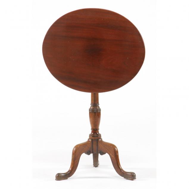 18th century, mahogany, oval tilt top, ring turned standard, high arched knee, raised pad foot.
