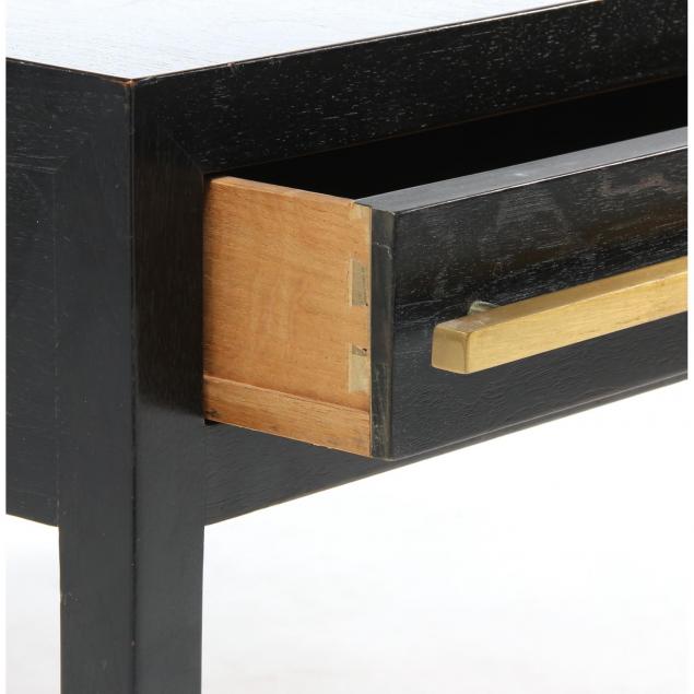 Mid 20th century, black lacquered case, single drawer with long brass pull, metal Baker label.