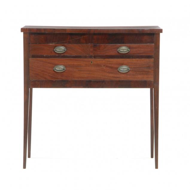 Circa 1800, likely upcountry South Carolina region, mahogany and mahogany veneer, yellow pine and poplar secondary, tall rectangular form two side-by-side drawers above one long drawer, top edge and drawer stiles with highly figured vertical veneer, veneered drawer fronts, raised on tall square tapered legs, paneled sides. Pencil script on back board not legible.