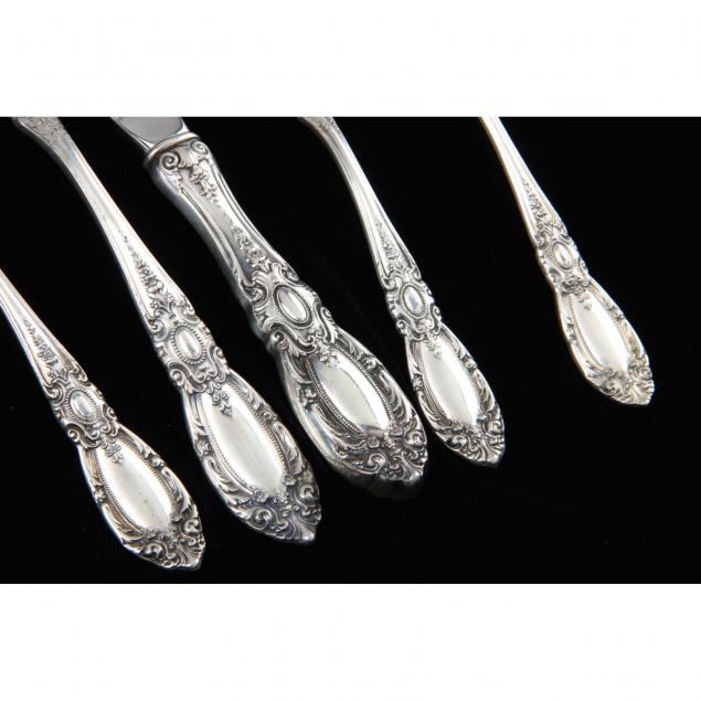 (26) pieces including: (3) knives (9.5 in.); (1) knife (8 5/8 in.); (3) forks (7.75 in.); (2) forks (7.25 in.); (6) salad forks; (7) teaspoons; jelly server; sugar spoon; lemon fork; cold meat fork.
