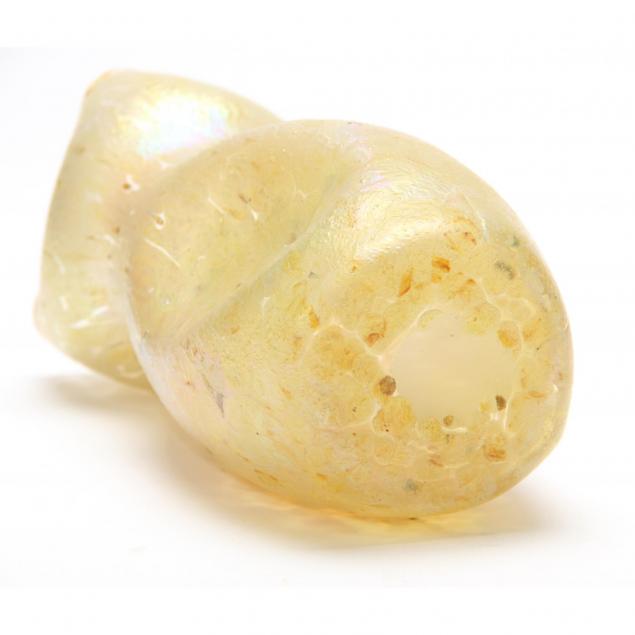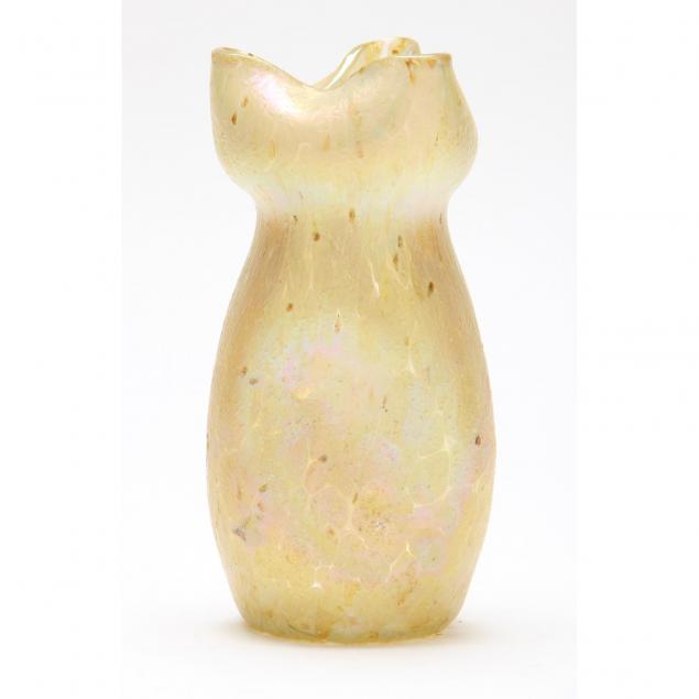 Circa 1900, pale green/yellow iridescent oil spot decoration, tooled rim, polished pontil, unmarked.