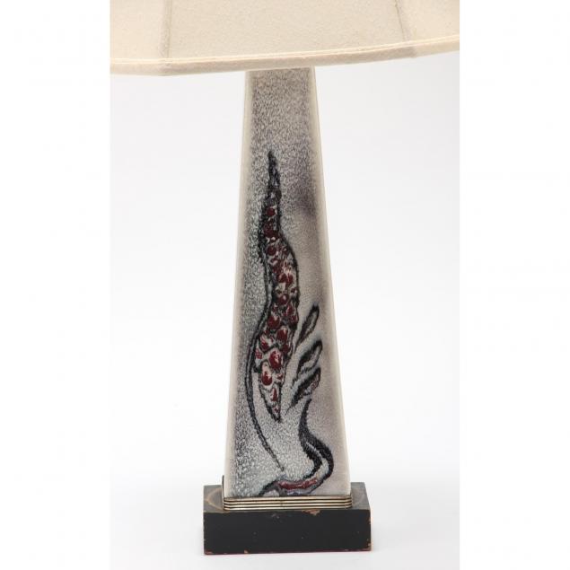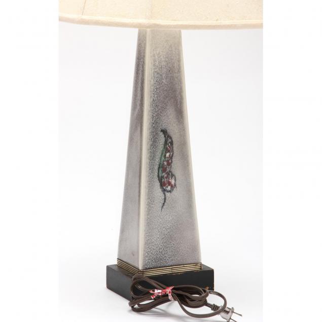 Pyramid form emblazoned with abstract floral design against a mottled gray-blue ground, on ebonized plinth, unmarked, linen shade.