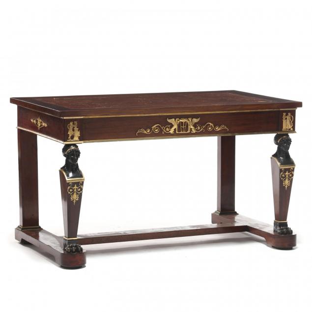 Late 19th century, mahogany veneers, leather inset top with pull out writing slides to each side, two side by side drawers, gilt metal classical ormolu mounts, the front legs with bronze female form supports terminating in bronze paw feet, flat "H" stretcher base.