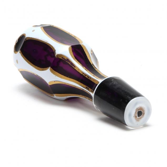 19th century, enameled white cut to amethyst decanter, with gilt highlights, unmarked.