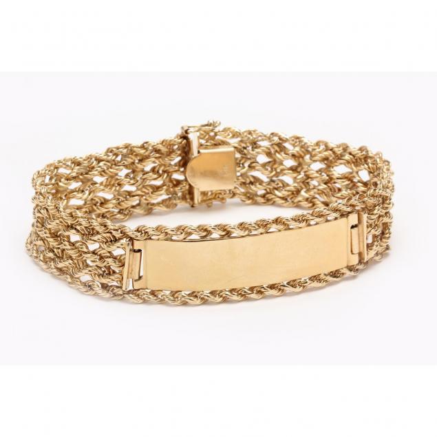 The flexible rope twist gold bracelet with a rectangular ID plaque set to the center within a rope twist frame and terminating in a box clasp stamped 14KT.