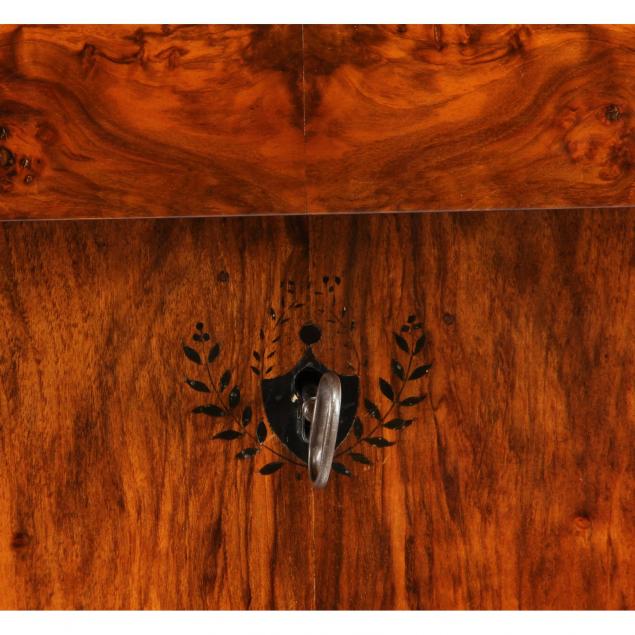 Probably Austrian, circa 1830, with frieze drawer over bookmatch-veneered fallboard opening to an ebonized and inlaid fitted architectural interior with a mirrored portico display with a total of eleven fitted drawers, flanked by ebonized columns over two long drawers, wreath-and-shield inlaid escutcheons, with key.