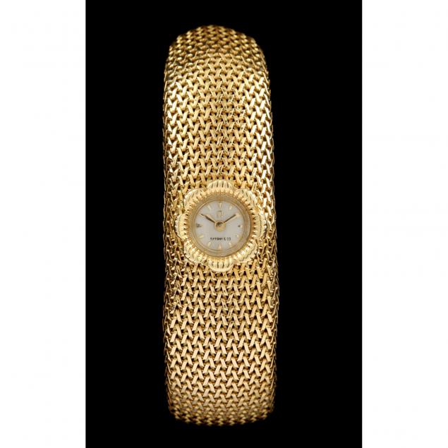 Manual wind to case reverse, the recessed ivory dial signed "Tiffany & Co." and with Omega logo, applied gold baton hour indicators with a petal motif bezel and completed with tapered mesh bracelet band with fold over clasp stamped 750.