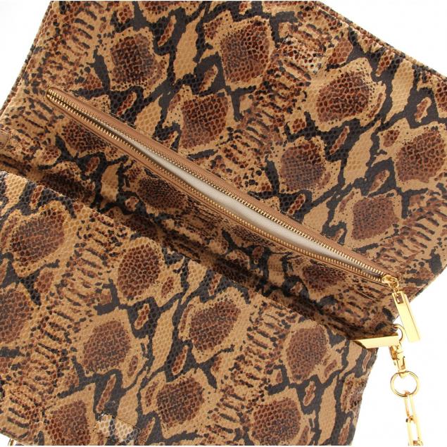 Composed of python print leather with signature metallic designer logo and a removable chain strap so the bag can worn on the shoulder or carried in hand, the flaps open to reveal (2) full width zippered compartments.