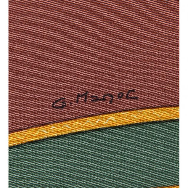 Made in France, multi-color over browns, designed by J. De Fougerolle, 1980s, featuring an equestrian design centered around the general riding his mount Laruns. (L' Hotte was general of the French cavalry from 1825 to 1904 and was appointed chief ecuyer of the cavalry school in 1864.) With care tag partially detached.
