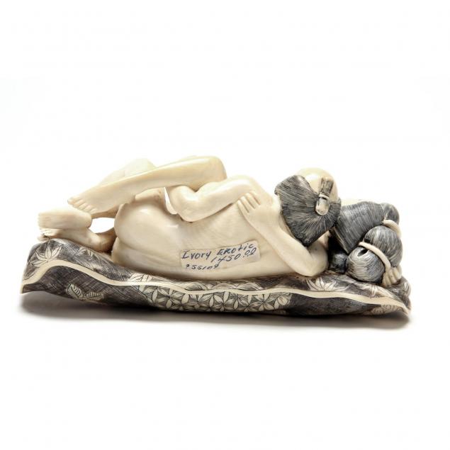 20th century, consisting of a couple engaged in intercourse- the man and woman can be joined or unjoined, the largest okimono has a couple reclining on a highly decorative pillow with waves, bamboo and flowers, largest okimono is signed.