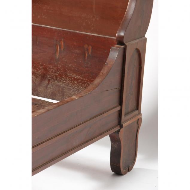 Caswell County, NC, mid 19th century, mahogany veneers, mahogany, white pine secondary, full size bed with paneled sides and stylized applied molded edge feet, with rails and slats, original casters and bolts.