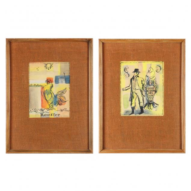 Rooster, signed with "WF" monogram lower right, both lined in burlap and presented in matching wooden frames.