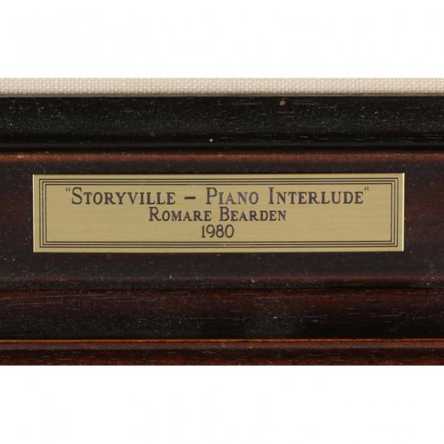 Collage with mixed media, signed at upper left "Romare Bearden," inscribed on the verso Stonyville: Piano Interlude (sic), framed under glass with linen liner and hardwood frame with gallery plaque.