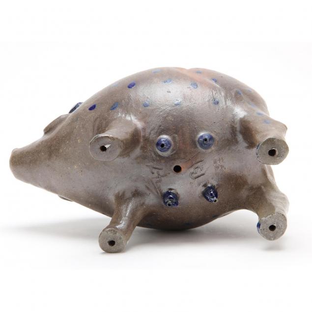 Large stoneware pig some features with cobalt highlights, the body with dots, inscribed on the bottom "BH 47."