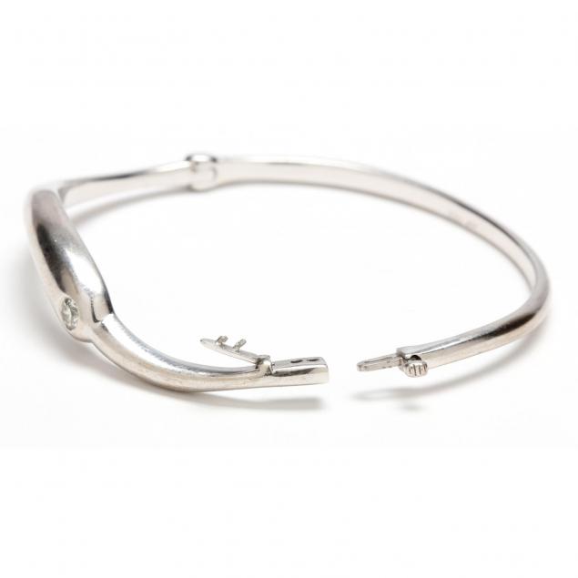 The hinged bracelet in bangle form and with one bezel set Hearts on Fire round brilliant cut diamond (3.30mm) weighing approximately .14 carat (G color, VS clarity) terminating in an integrated clasp with side safety lock.