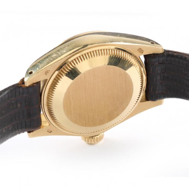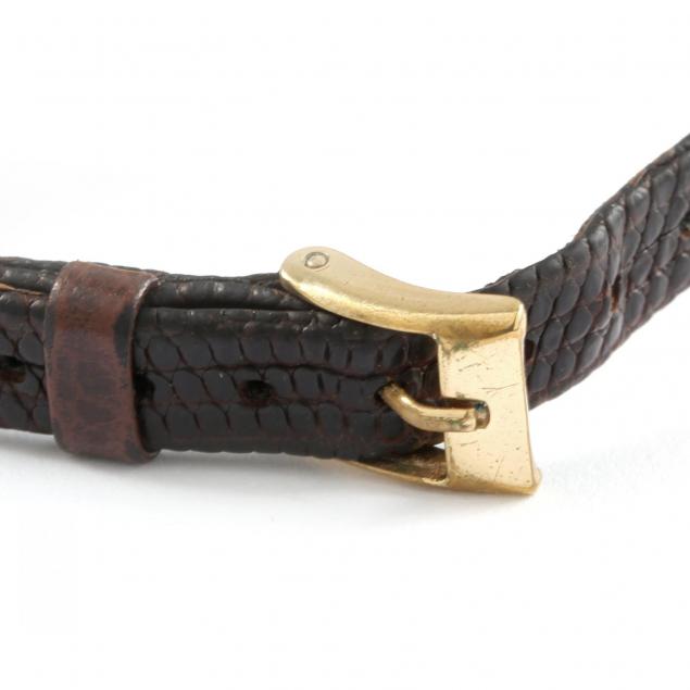 Circa 1980, superlative chronometer, case with fluted gold bezel, with malachite dial and date window at the three o'clock and second hand sweep, completed with a Hirsch black lizard skin strap band with gold filled buckle, Reference #6917 and Serial #6486916