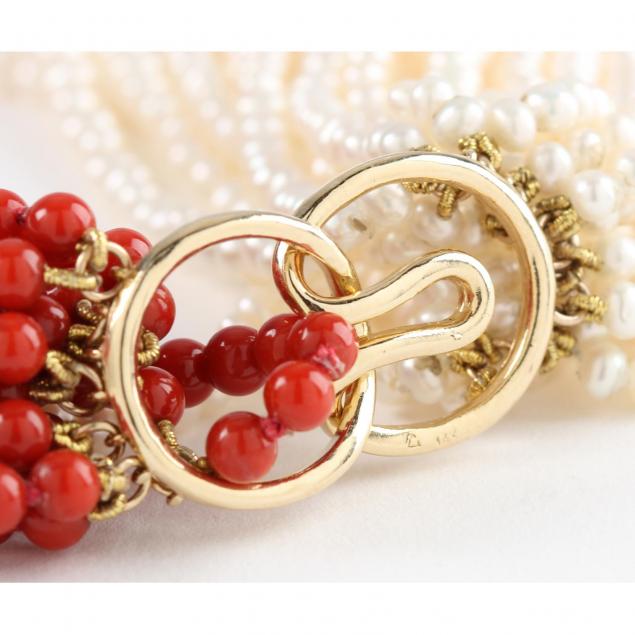 Necklace comprised of (24) strands of freshwater cultured pearls (3.45mm) and (14) strands of red coral beads (4.00mm) and terminating in a stamped 14KT yellow gold toggle clasp.