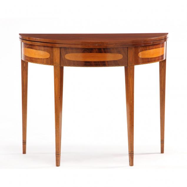 Circa 1800, mahogany, mahogany veneers, light and dark wood inlays, chestnut and mixed woods secondary, demilune form with hinged top supported by swing leg, skirt with three panels featuring a rectangular light wood oval inlay with line inlay border, base of skirt with stylized light and dark wood herringbone inlays, square tapered legs inlaid with stylized icicle terminating with teardrop, cuff inlays.