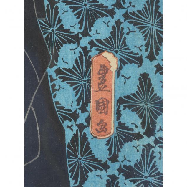 Utagawa Toyokuni (1769-1825) hooded actor in snow (very good condition); Utagawa Toyokuni (1769-1825) actor next to folding screen (multiple small holes on the left side of print and minor foxing in the center), both framed under glass.