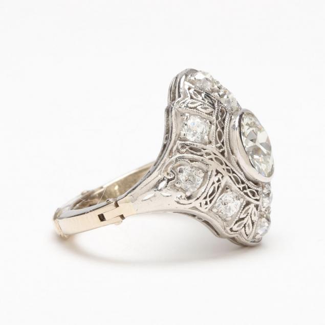 The platinum dome and filigree mount centered with one bezel set old European cut diamond weighing approximately 1.06 carat (J color, SI1 clarity) and accented with (10) bead set old European cut diamonds weighing approximately .80 total carat (H-I color, SI1 clarity), with a 14KT white gold fitted shank.