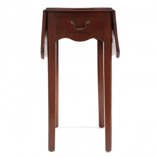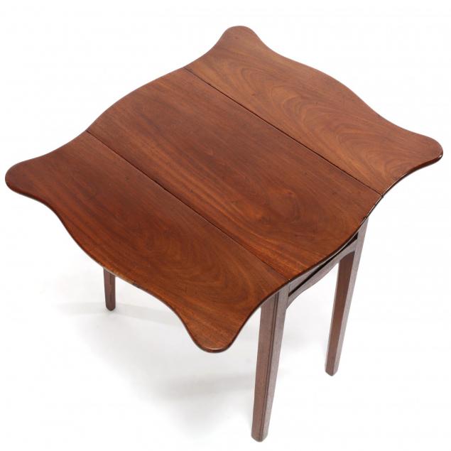 Circa 1800, mahogany, oak secondary, rectangular shaped top with shaped drop leaves and double butterfly support, single drawer with scratch bead, tall square molded legs with inside chamfer.
