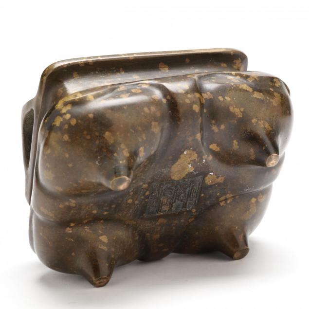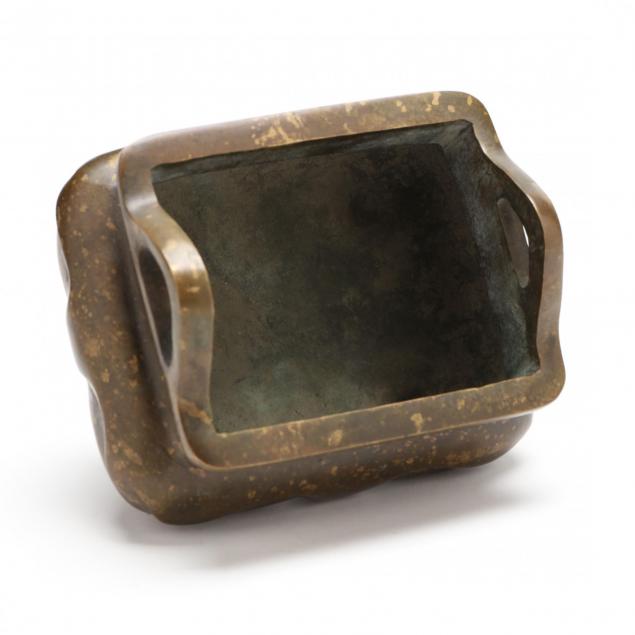 The base cast with a four-character Xuande reign mark within a recessed panel, the deep rectangular basin is raised on four short bulbous legs, everted rim with flat edge, two small handles, the bronze has small gold splashes all over the body these were achieved by fire gilding, a process by which gold is applied with mercury and then heated until the mercury evaporates and leaves the gold behind.