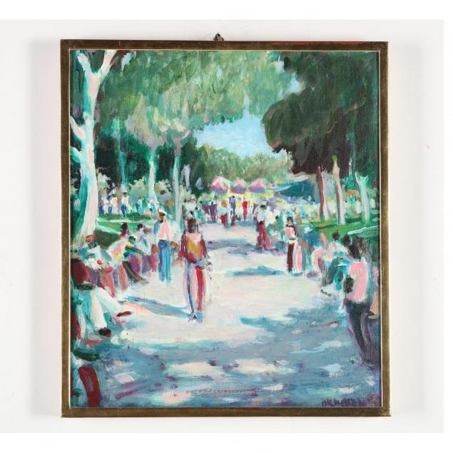Acrylic on board, signed and dated 1983 at lower right, presented in a floater frame with gilt finish and blonde wood sides.