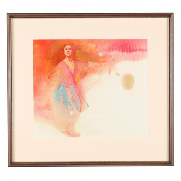 Patricia (McBride), pencil signed and dated 1993, matted and framed under glass (DOA 17.5 x 13.5 in.); the second an oil on paper by Steve Childs (GA/NC), titled "The Feeling is There," signed at lower center, matted and framed under glass (DOA 24.25 x 26.25 in.) (purchased from Art Gallery Originals, Reynolda Village, Winston-Salem, NC) (with large area of staining to right of figure).